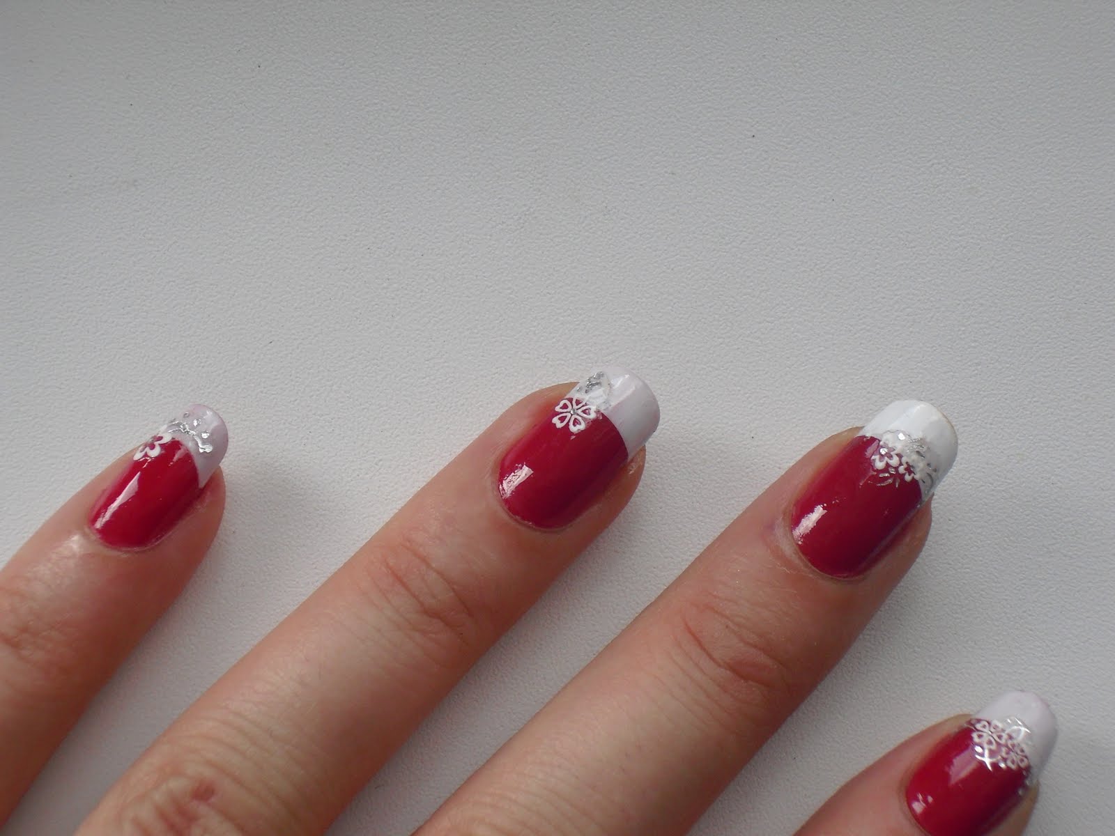 Ultima manichiura am realizat-o in 3 pasi (zile diferite). Fiind mai mereu pe fuga nu aveam timp sa le termin cum as fi vrut. Astfel, vineri seara am facut baza, sambata am dat french-ul cu alb iar duminica seara nu prea imi placeau cum arata dar nici nu aveam timp/chef sa le sterg si sa fac altceva. Asa ca am aplicat niste stickere cu floricele albe si putin silver. Rezultatul - ce vedeti mai jos: